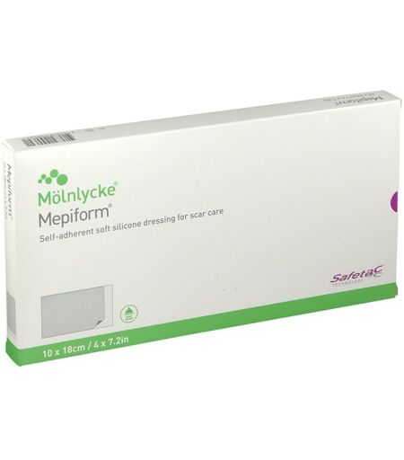 Taille du pansement:10 cm x 18 cmIndication:Cicatrices hypertrophiques anciennes ou récentes, chéloïdesPlaies fermées, en prévention de la formation de cicatrices hypertrophiques et chéloïdesDescription du produit:Mepiform® est un pansement auto-adhésif indiqué pour réduire et prévenir la formation de cicatrices hypertrophiques ou chéloïdes.Sa couche Safetac permet de retirer et appliquer le pansement de nouveau sans perte de son pouvoir adhérant. Ces pansements se retirent avec douceur, sans douleur pour la peau.Mince, souple et discretFacile à utiliserAdapté aux activités du quotidienPeut être enlevé et remis en placeUn seul pansement Mepiform® peut être porté pendant 7 jours en moyenneConseils d'utilisation:Retirer le film protecteur. Si besoin, découper la forme souhaitée, avant d’enlever le film protecteur. Appliquer Mepiform® sur une peau propre et sèche. Enlever le pansement une fois par jour pour nettoyer la peau. Après la douche ou le bain, attendez quelques minutes avant de le remettre en place.Conditionnement5 pansements ...