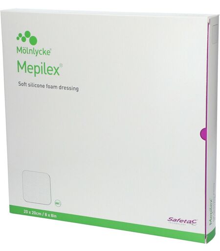 Taille du pansement:20 x 20 cmIndication:Mepilex® est conçu pour le traitement des plaies exsudatives. Vous pouvez adapter la taille de Mepilex® en le découpant pour correspondre à la localisation et la taille de la plaie. Cela en fait un pansement adapté pour les régions difficiles à traiter. Vous pouvez utiliser Mepilex avec notre système de fixation Tubifast™ .Doux et souple, ce qui le rend facile à utiliser et polyvalent.Moins de douleur lors du changement de pansementFerme les bords de la plaie pour éviter la macération. Gestion efficace de l'exsudat Description du produit:Mepilex est un pansement en mousse absorbante pour le traitement d'une large gamme de plaies chroniques et aiguës. Les propriétés hautement absorbantes assurent une prise en charge efficace de l'exsudat de la plaie. Chaque pansement Mepilex est doté de Safetac, une couche de contact en silicone qui minimise la douleur. Il est donc facile de retirer le pansement sans endommager la peau. De plus, Safetac scelle les bords de la plaie pour protéger la peau des dommages causés par les fuites et la macération. Mepilex peut être coupé sur mesure selon les besoins.Conseils d'utilisation:Avant d'appliquer le pansement, nettoyez systématiquement la plaie. Le pansement doit recouvrir le lit de la plaie en dépassant d'au moins 2 cm sur la peau périlésionnelle. Utilisez Tubifast lorsqu'une fixation est nécessaire.Conditionnement5 pansements ...