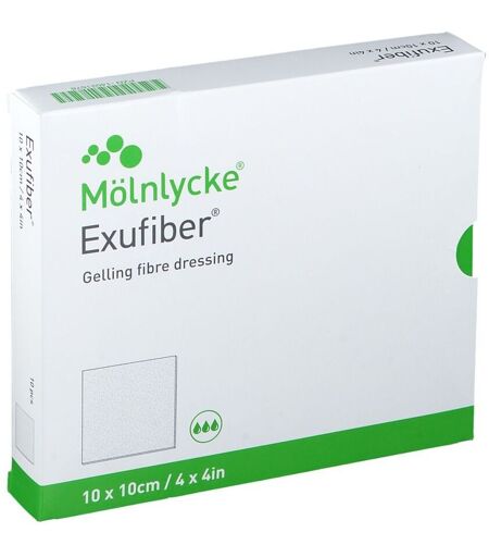 Mölnlycke® Exufiber 10 x 10 cm Taille du pansement : 10 x 10 cm Exufiber est un pansement non tissé stérile fait de fibres d'alcool polyvinylique (PVA) très absorbantes. Au contact de l'exsudat de la plaie, Exufiber forme un gel qui permet une cicatrisation humide et un changement de pansement facile. L'Exufiber assure une absorption et une rétention élevées. L'Exufiber convient à une variété de plaies exsudatives superficielles et profondes. ...