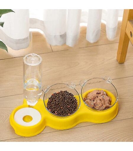 Triple Dog Cat Bowls Automatique Pet Feeder 15tilt Et 360rotatable Double Food Bowl Avec Automatique Bouteille D'eau Bol Détachable Petit Et Moyen-Jaune