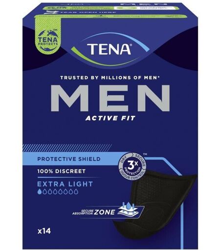 TENA Men Protective Shield Extra Light 750403Vous cherchez un produit efficace à recommander qui aide les hommes ayant des fuites urinaires légères ? La Protection Discrète Extra Light TENA MEN reste bien en place, en toute discrétion, dans le sous-vêtement et présente un noyau ultra absorbant qui gère les fuites, les odeurs et l’humidité. Elle est aussi ultra légère, douce et fine et arbore un design noir et masculin. Recommandée pour les hommes de tout âge, la Protection Discrète Extra Light TENA MEN offre une protection parfaite contre les fuites urinaires légères pour le travail, en voyage ou pendant le sport, et bien d’autres situations. Extra fines Capture les fuites Forme confortable Extra finesExtra fines tout en offrant une sécurité remarquable et une grande discrétionCapturent les fuitesZone absorbante pour capturer les fuites efficacementForme confortableForme spécialement adaptée à l’anatomie masculineSystème de contrôle des odeursAide à prévenir les odeurs indésirablesBande adhésive de fixationGarde la protection en place pour un ajustement sur et discret dans le sous-vêtements masculinsAvec emballage individuelFaciles à emporter et à jeter discrètementTestées dermatologiquementMatériaux doux pour la peauApplication Sortez la protection de son emballage individuel et dépliez-la. La partie la plus large du produit doit être orientée vers le haut. Retirez la bande adhésive et jetez-la à la poubelle. Fixez la protection à l’intérieur de votre sous-vêtement grâce à la bande autocollante. Positionnez le produit confortablement. Vous pouvez repositionner votre protection simplement en la décollant puis en la fixant à nouveau. Notez que ce produit convient particulièrement aux sous-vêtements ajustés en coton. Pour jeter votre protection, enlevez-la simplement de votre sous-vêtement et jetez-la à la poubelle. Ne le jetez pas dans la cuvette des WC. Vous pouvez utiliser l’emballage individuel pour y placer discrètement votre protection avant de la jeter. ...