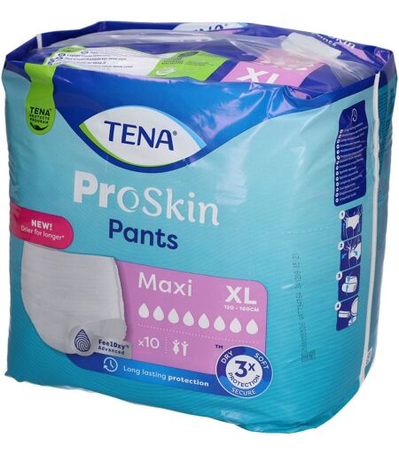 TENA Proskin Pants Maxi XLTENA Proskin Pants Maxi XL sont des culottes d'incontinence douces et confortables pour femmes et hommes, qui offrent une protection fiable de jour comme de nuit. La technologie FeelDry Advanced™ évacue rapidement les liquides de la peau et les emprisonne en toute sécurité dans le noyau hautement absorbant pour garantir la sécheresse et la santé de la peau.Les culottes sont fabriquées dans des matériaux respirants semblables aux textiles et offrent une excellente absorption. Ils disposent d'une double zone d'absorption pour une protection optimale, de bords anti-fuites intégrés pour une sécurité supplémentaire et d'un neutralisateur d'odeurs pour réduire les odeurs d'ammoniaque. La coupe ressemble à celle d'un sous-vêtement normal et favorise une vie active et indépendante.Application:Portez-les comme des sous-vêtements normaux et jetez-les après usage. ...