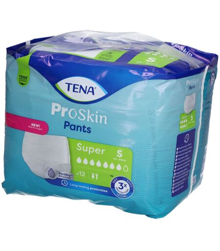 TENA Pants Super ProSkin STENA Pants Super ProSkin S sont des culottes jetables pratiques pour les hommes et les femmes souffrant d'incontinence urinaire moyenne à forte. Elles combinent la sécurité d'un noyau absorbant et la simplicité d'un sous-vêtement.La technologie innovante ConfioFit™ assure un ajustement près du corps et augmente le confort. Grâce à la surface FeelDry™, les liquides sont rapidement dirigés vers le noyau et emprisonnés en toute sécurité pour garantir la sécheresse et la protection de la peau. Le matériau respirant Air Dry Layer™ minimise les irritations cutanées, tandis que l'Odour Neutralizer™ empêche les mauvaises odeurs.Application:Porter comme des sous-vêtements normaux. Pour l'enlever, déchirer les coutures latérales et le jeter après usage. ...