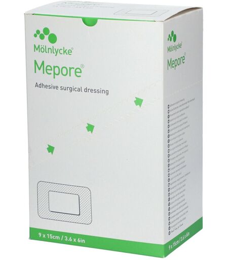 Mepore® est un pansement en nontissé extensible avec un adhésif de polyacrylate à haute tolérance cutanée et une compresse hypo-adhérente à la plaie. Il se présente sous forme de rouleau non stérile ou de pansement stérile.Mepore est indiqué pour le traitement des plaies aigües peu à modérément exsudatives telles que les plaies chirurgicales (incisions chirurgicales, plaies post-opératoires suturées), les plaies traumatiques superficielles et les dermabrasions.BénéficesAbsorption du sang et des exsudats grâce à la compresse absorbante et hypo-adhérente à la plaie.Fixation sécurisée et douce pour la peau grâce à sa masse adhésive à haute tolérance cutanée.Perméable à l'air et à la vapeur d'eau pour éviter les phénomènes de macération.Souple et extensible : conformable à toutes les localisations même les articulations.Feuillets protecteurs avec repli "portefeuille" pour une application facile et limitant les risques de fautes d'asepsie.Large choix de tailles pour tous types de plaies.Conseils d'utilisationLes bords adhésifs de Mepore scellent la zone autour de la plaie et empêche toute contamination externe. La surface nontissée déperlante à l'eau, protège la plaie tout en permettant les échanges gazeux pour limiter la macération. L'adhésif non sensibilisant et non irritant réduit les risques. La compresse hypo-adhérente limite l'adhésion à la plaie.Choisir la taille appropriée de pansement pour que la compresse recouvre entièrement la plaie. Ouvrir le sachèt et enlever le premier feuillet protecteur.Appliquer la partie adhésive du Mepore®sur la peau propre, saine et sèche. Enlever le deuxième feuillet protecteur.Appliquer doucement l'autre partie adhésive, sans étirer, sur toute sa surface pour obtenir une adhésion complète. ConditionnementPaquet de 50 pansements ...