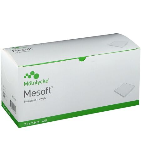Mesoft permet un nettoyage efficace de la peau ou des plaies. Grâce à sa composition en nontissée, Mesoft est doux pour la peau et non abrasif pour les plaies. Les compresses Mesoft relarguent moins de particules que les compresses tissées et sont plus absorbantes.Utilisées en complément d'une interface (Mepitel®, Mepilex® Transfer), un alginate (Melgisorb® Plus) ou tout autre pansement primaire, les compresses Mesoft permettent l'absorption des excédents d'exsudats.BénéficesTrès bonne capacité d'absorption.Doux pour la peau, non abrasif pour les plaies.Faible relargage particulaire.Détersion mécanique efficace.Haute qualité et large assortiment.ApplicationNettoyage / Antisepsie d'une plaie: Ouvrir le sachèt de compresses. Saisir le nombre de compresses avec une pince ou avec des gants Appliquer l'antiseptique choisi sur la compresse Nettoyer la plaie des berges vers la centre de la plaie. Renouveler l'opération si nécessaire. Rincer l'antiseptique si nécessaire, en utilisant une compresse neive et du sérum physiologique.Nettoyage / Antisepsie de la peau saine avant un geste chirugical: Ouvrir le sachet de compresses. Saisir le nombre de compresses avec une pince ou avec des gants. Appliquer l'antiseptique choisi sur la compresse Nettoyer la peau du centre (point de ponction, d'injection ou incision) vers la périphérie. Renouveller l'operation si nécessaire. Rincer l'antiseptique si nécessaire, en utilisant une compresse neuve et du sérum physiologique.Absorption des exsudats en complément d'un pansement primaire: Poser une interface ou un alginate directement sur la plaie. Ouvrir le sachet de compresses. Saisir le nombre de compresses avec une pince ou avec des gants. Appliquer les compresses sur le pansement primaire. Fixer avec un ou un bandage tubulaire.. ...