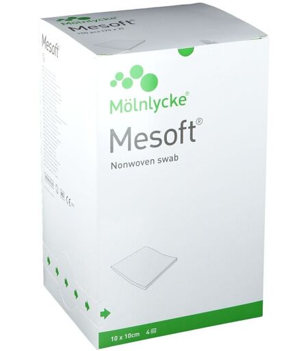 Mesoft permet un nettoyage efficace de la peau ou des plaies. Grâce à sa composition en nontissée, Mesoft est doux pour la peau et non abrasif pour les plaies. Les compresses Mesoft relarguent moins de particules que les compresses tissées et sont plus absorbantes.Utilisées en complément d'une interface (Mepitel®, Mepilex® Transfer), un alginate (Melgisorb® Plus) ou tout autre pansement primaire, les compresses Mesoft permettent l'absorption des excédents d'exsudats.BénéficesTrès bonne capacité d'absorption.Doux pour la peau, non abrasif pour les plaies.Faible relargage particulaire.Détersion mécanique efficace.Haute qualité et large assortiment.ApplicationNettoyage / Antisepsie d'une plaie: Ouvrir le sachèt de compresses. Saisir le nombre de compresses avec une pince ou avec des gants Appliquer l'antiseptique choisi sur la compresse Nettoyer la plaie des berges vers la centre de la plaie. Renouveler l'opération si nécessaire. Rincer l'antiseptique si nécessaire, en utilisant une compresse neive et du sérum physiologique.Nettoyage / Antisepsie de la peau saine avant un geste chirugical: Ouvrir le sachet de compresses. Saisir le nombre de compresses avec une pince ou avec des gants. Appliquer l'antiseptique choisi sur la compresse Nettoyer la peau du centre (point de ponction, d'injection ou incision) vers la périphérie. Renouveller l'operation si nécessaire. Rincer l'antiseptique si nécessaire, en utilisant une compresse neuve et du sérum physiologique.Absorption des exsudats en complément d'un pansement primaire: Poser une interface ou un alginate directement sur la plaie. Ouvrir le sachet de compresses. Saisir le nombre de compresses avec une pince ou avec des gants. Appliquer les compresses sur le pansement primaire. Fixer avec un ou un bandage tubulaire.. ...