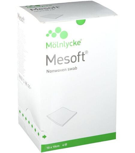 Mesoft permet un nettoyage efficace de la peau ou des plaies. Grâce à sa composition en nontissée, Mesoft est doux pour la peau et non abrasif pour les plaies. Les compresses Mesoft relarguent moins de particules que les compresses tissées et sont plus absorbantes.Utilisées en complément d'une interface (Mepitel®, Mepilex® Transfer), un alginate (Melgisorb® Plus) ou tout autre pansement primaire, les compresses Mesoft permettent l'absorption des excédents d'exsudats.BénéficesTrès bonne capacité d'absorption.Doux pour la peau, non abrasif pour les plaies.Faible relargage particulaire.Détersion mécanique efficace.Haute qualité et large assortiment.ApplicationNettoyage / Antisepsie d'une plaie: Ouvrir le sachèt de compresses. Saisir le nombre de compresses avec une pince ou avec des gants Appliquer l'antiseptique choisi sur la compresse Nettoyer la plaie des berges vers la centre de la plaie. Renouveler l'opération si nécessaire. Rincer l'antiseptique si nécessaire, en utilisant une compresse neive et du sérum physiologique.Nettoyage / Antisepsie de la peau saine avant un geste chirugical: Ouvrir le sachet de compresses. Saisir le nombre de compresses avec une pince ou avec des gants. Appliquer l'antiseptique choisi sur la compresse Nettoyer la peau du centre (point de ponction, d'injection ou incision) vers la périphérie. Renouveller l'operation si nécessaire. Rincer l'antiseptique si nécessaire, en utilisant une compresse neuve et du sérum physiologique.Absorption des exsudats en complément d'un pansement primaire: Poser une interface ou un alginate directement sur la plaie. Ouvrir le sachet de compresses. Saisir le nombre de compresses avec une pince ou avec des gants. Appliquer les compresses sur le pansement primaire. Fixer avec un ou un bandage tubulaire.. ...