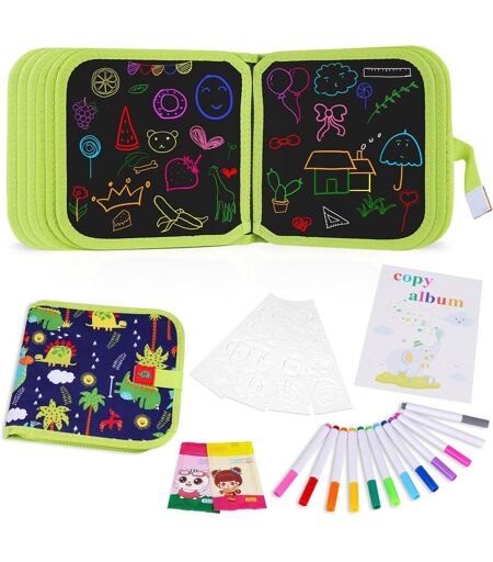 \u2014\u2014 KIDS TRAVEL VALUE SET \u2014\u2014 ¿ You will receive 1 16-side doodle board, 2 packs of wet wipes, 12 watercolour pencils, 1 copying book,4 modèles, help children have more drawing choices, show children's talent, improve their imagination and drawing skills. \u2014\u2014 PINCEAU DE PEINTURE EFFACABLE \u2014\u2014 ¿ Pinceaux effaçables conçus, les couleurs peuvent être enlevées à l'aide de lingettes humides ou d'un chiffon humide. Le carton à dessin réutilisable et écologique permet aux enfants de corriger leurs erreurs pendant qu'ils dessinent. Le dernier côté de la planche à dessin est équipé d'une pochette à stylos en maille noire pour ranger les pinceaux et autres petits accessoires afin d'éviter de les perdre et de garder l'ensemble bien rangé. \u2014\u2014 JOUETS ÉDUCATIFS POUR ENFANTS \u2014\u2014 ¿ Le livre de dessin amusant pour enfants peut inspirer la créativité et l'imagination infinies des enfants, laisser les enfants facilement et librement encore dans le divertissement pour apprendre la peinture, l'arithmétique, les mots, etc, tout en améliorant la perception de la couleur, améliorer la capacité de pensée logique et la capacité pratique. \u2014\u2014 HAUTE QUALITÉ \u2014\u2014 ¿ Le livre de coloriage portable pour enfants est fabriqué en tissu Oxford de haute qualité + matériel pp, résistant à la déchirure, durable, non toxique, sans poussière, sûr et léger. Les bords de la planche à dessin sont soigneusement manipulés avec des coins arrondis pour empêcher votre enfant de se blesser pendant la peinture de volonté. \u2014\u2014 WIDE USE \u2014\u2014 ¿ Le livre de coloriage est un cadeau idéal pour les enfants de plus de 3 ans, peut être utilisé comme cadeau pour les anniversaires des enfants, les fêtes, les festivals importants, etc, et peut également être utilisé comme récompense pour la classe ou la famille. ...