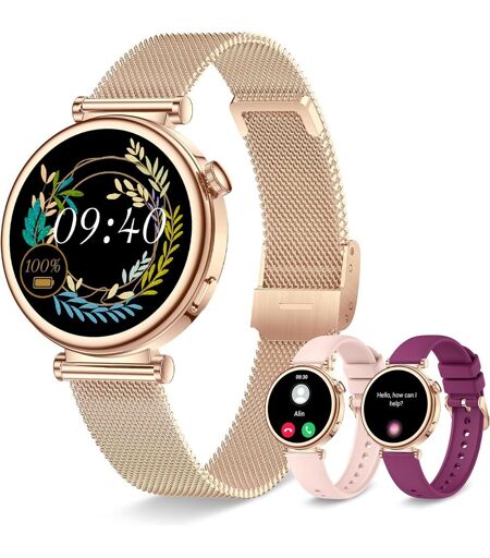 Montre connectée petit poignet Montre connectée femme ronde avec écran HD tactile de 1,27"" (41 mm) au design élégant ; montre femme livrée avec trois bracelets pour un style personnalisé ; montre connectée tendance adaptée aux préférences féminines 200+ cadrans Montre connectée femme avec plus de 200 cadrans disponibles ou personnal z-les avec vos propres photos (famille, animaux, etc.) pour s'adapter à toutes vos humeurs ; changez facilement entre quatre styles de menu pour un look unique Montre connectée repondre appel Bluetooth Smartwatch avec technologie Bluetooth 5.3 pour des appels stables ; passez, acceptez ou rejetez des appels depuis le bracelet montre connectée ; gérez 10 contacts et consultez l'historique d'appels Notifications intelligentes Montre femme connectée offrant des alertes en temps réel pour mes s, appels et apps (Facebook, WhatsApp, etc.) ; notifications directement au poignet par vibration ou sonnerie (réception uniquement) Suivi d'activité avancé Montre sport pour le suivi des pas, des ies et de la distance ; montre connectée sport avec huit modes sportifs intégrés et plus de 100 modes supplémentaires via l'application ; idéale pour atteindre vos objectifs fitness Suivi de la santé Montre connectée pour une surveillance 24/7 du rythme cardiaque, du sommeil et des pas ; améliorez votre relaxation grâce à des exercices de respiration ; inclut des rappels d'hydratation, de pauses et un suivi menstruel Assistant vocal IA Activez et contrôlez les assistants vocaux comme Siri, Bixby et Google Assistant directement depuis la montre, pour plus de commodité au quotidien sans sortir votre téléphone Fonctionnalités essentielles Smart watch avec recherche de téléphone, calculatrice, prévisions météo, réveil, lecteur de musique, contrôle de la caméra, chronomètre, minuterie, ainsi que luminosité et vibrations ajustables Durabilité et praticité Smartwatch femme avec batterie 290mAh offrant plus de 24h d'autonomie ; étanchéité IP67 pour la pluie, le lavage des mains et la transpiration ; montre digitale femme robuste au quotidien Large compatibilité Montre connectée Android compatible avec Android 4.4 et supérieur, iOS 7.1 et supérieur ; montre connectée fonctionne parfaitement avec vos appareils existants ...