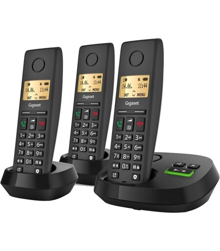 TÉLÉPHONIE FIABLE - Avec le Gigaset PURE 220A Trio, vous pouvez bloquer les appels indésirables et profiter d'une téléphonie pratique et fiable. Compatibilité avec DE, IT, FR, NL, CHE, AUT - Plus d\u2019informations sur le site web de Gigaset. FONCTIONS PRATIQUES - 3 Téléphones sans fil avec répondeur, conception particulièrement ergonomique INSTALLATION FACILE - Branchez simplement la station de base à la pr téléphonique murale et commencez à téléphoner immédiatement QUALITY MADE IN GERMANY - conçu et fabriqué en Allemagne - la technologie ECO DECT, respectueuse de l'environnement, permet de réduire la consommation d'énergie CONTENU DU COFFRET - 1x station de base Gigaset PURE 220A avec répondeur, 3x combinés Gigaset PURE 220, 2x stations de charge, 3x blocs d'alimentation, 1x câble de raccordement téléphonique, x 6piles AAA (NiMH), 3x couvercles de batterie, 1x manuel d'utilisation Vous avez des questions sur ce produit Contactez le service client Gigaset au +33 (0)157 324 522 (coût de l'appel vers une ligne fixe selon les tarifs de votre opérateur) ...