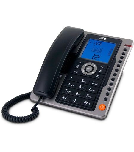 TÉLÉPHONE POUR MAISON OU BUREAU Office Pro est doté de grandes touches et d'un grand écran lumineux bleu avec 8 niveaux de contraste. Il peut être utilisé comme téléphone bureau ou mural. Il se branche sur la pr de votre téléphone grâce à son connecteur RJ11 et est livré avec 3 piles AA (non incluses) pour illuminer l'écran et profiter de toutes ses fonctionnalités. MÉMOIRES DIRECTES ET MAINS LIBRES Bien que ce téléphone fixe filaire ne dispose pas d'un répertoire, vous pouvez util r ses 7 mémoires directes qui, en appuyant simplement sur un bouton, vous appellera au numéro que vous avez configuré. Profitez de la commodité de parler en mains libres en décrochant et en raccrochant l'appel en appuyant simplement sur le bouton du haut-parleur. IDENTIFICATEUR DAPPEL À LÉCRAN Vous saurez toujours quel numéro vous appelle si vous avez souscrit ce service auprès de votre opérateur téléphonique. Visual z jusqu'à 66 enregistrements d'appels sur le grand écran éclairé de SPC Office Pro. Le symbole NEW sur l'écran indique que vous avez des appels en attente de révision. FONCTIONS DE BUREAU Si vous voulez util r votre Office Pro en mode bureau, vous pouvez profiter de fonctions telles que l'activation de la musique d'attente pendant un appel en appuyant sur la touche SONNERIE, l'option MUTE si vous ne voulez pas être entendu par la personne de lautre côté, et le transfert d'appel si vous avez un autre modèle comme celui-ci connecté à ce téléphone. TÉLÉPHONE FIXE BUREAU ÉLÉGANT ET FONCTIONNEL Au bureau ou à la maison, nimporte quel endroit sera parfait pour un téléphone design élégant. Choisissez la sonnerie qui convient le mieux à votre espace parmi les 9 sonneries-mélodies intégrées. Il comprend un calendrier, la date et l'heure, un bouton de recomposition du dernier numéro, une calculatrice et la possibilité de configurer jusqu'à 5 al . ...