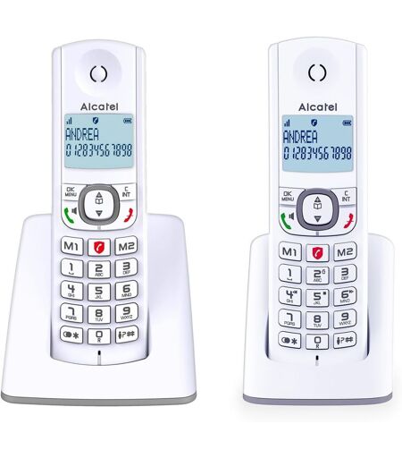LISIBILITÉ OPTIMALE Ce téléphone fixe sans fil Alcatel dispose dun grand écran rétroéclairé à 2 lignes qui affiche le nom et le numéro. Possibilité de régler le volume sur 5 niveaux et sélectionner une sonnerie. 2e combiné facile à installer. FONCTION MAINS LIBRES AVEC VOLUME RÉGLABLE Grâce à son haut-parleur avec volume réglable sur 5 niveaux, ce téléphone sans fil vous permet continuer votre conversation tout en ayant les mains libres pour pouvoir vaquer à vos occupations. STOCKEZ JUSQU'À 100 CONTACTS Ce téléphone peut stocker jusqu'à 100 contacts et garder une trace des 50 derniers appels. Accédez à vos contacts fréquents grâce aux 5 touches dappel direct et profitez de la fonction VIP pour identifier l'appelant avec une sonnerie spécifique. BLOQUEZ LES NUMÉROS INDÉSIRABLES Le téléphone fixe Alcatel F530 offre une fonction de blocage d'appels facile grâce à une touche dédiée, permettant de bloquer jusqu'à 100 numéros. Un mode automatique permet également de bloquer tous les numéros sauf ceux du répertoire. LEADER DE LA TÉLÉPHONIE Marque dorigine frança spécialisée dans les télécommunications, Alcatel est lun des leaders mondiaux dans le domaine de la téléphonie. ...