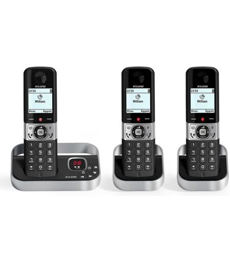 GRAND ÉCRAN GRAPHIQUE Ce téléphone fixe sans fil avec répondeur offre un menu intuitif, un grand écran rétroéclairé bleu pâle et un contraste réglable. La fonction VIP permet d'identifier l'appelant avec une sonnerie spécifique. Installation facile des combinés supplémentaires. RÉPONDEUR ENREGISTREUR 50 MIN Le répondeur intégré de 50 minutes d\u2019enregistrement est très simple à util r grâce aux touches d\u2019accès sur la base et le téléphone. Un compteur vous informe également des nouveaux mes s d\u2019un seul coup d\u2019?il. STOCKEZ JUSQU'À 200 CONTACTS Le grand répertoire permet d\u2019enregistrer jusqu\u2019à 200 contacts. De plus, ce téléphone sans fil intègre une fonction mains libres qui vous permet de continuer vos conversations tout en vaquant à vos occupations. NON AUX APPELS INDÉSIRABLES Les appelants hors répertoire doivent entrer un code pour faire sonner le téléphone. Les appels automatisés, anonymes et internationaux sont automatiquement rejetés. Bloquez n'importe quel numéro en temps réel avec une touche dédiée. Blocage jusqu'à 1000 numéros. LEADER DE LA TÉLÉPHONIE Marque d\u2019origine frança spécialisée dans les télécommunications, Alcatel est l\u2019un des leaders mondiaux dans le domaine de la téléphonie. ...