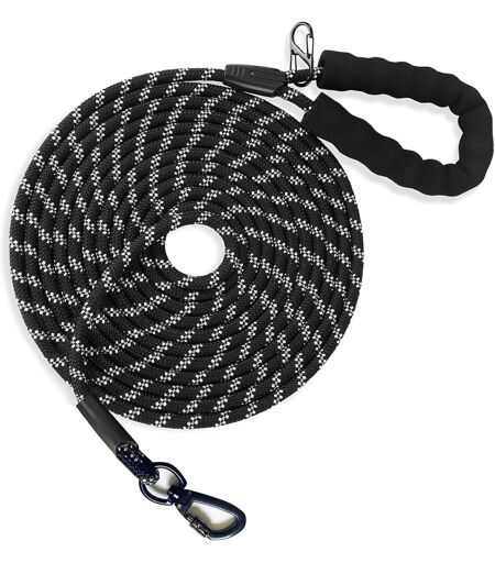 Crochet unique en forme d'os verrouillable Notre laisse pour chiens est équipée de ce crochet amélioré, doté d'un verrouillage pour garantir que la boucle de la laisse est sûre et ne s'ouvre pas inopinément, et qui permet une rotation à 360° à tout moment. Vos chiens pourront se déplacer joyeusement et en toute sécurité autour de vous sans se retrouver enchevêtrés. Laisse réfléchissante robuste pour chiens Cette laisse robuste pour chiens est fabriquée à partir d'un nylon ultra-résistant, avec un fil réfléchissant cousu sur toute sa longueur pour améliorer la visibilité la nuit devant les véhicules approchant avec les phares allumés. Elle vous permet de contrôler parfaitement votre chiot ou votre chien, tout en lui permettant sa liberté pour faire ses besoins. Poignée matelassée douce La poignée de la laisse longue est faite d'EVA, un matériau doux et résistant, offrant une poignée anti-choc confortable, protégeant votre main des égratignures du cordage, et vous permettant de profiter de nombreuses p nades agréables avec votre chien, sans aucun souci. Laisses en cordage pour toutes les races de chiens La laisse longue d'un diamètre de 0.8 cm peut convenir aux petits chiens, chats ou autres petits animaux. Elle est également le choix idéal pour les laisses d'entraînement pour les grands chiens ou les chiens de taille moyenne. Parfaite corde pour chiens en extérieur Cette grande laisse pour chiens est idéale pour les sports d'extérieur tels que la randonnée, le camping, l'entraînement, la chasse, le jardin, la plage, l'escalade, la marche, la course, et bien plus. Désormais, vous pouvez emmener vos animaux de compagnie avec vous dans toutes sortes d'aventures. ...