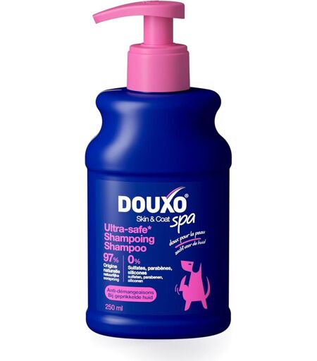 NETTOYAGE ULTRA-SÛR, HYPOALLERGÉNIQUE ET DOUX POUR LA PEAU le shampoing anti-démangeaisons DOUXO Skin & Coat SPA offre un nettoyage doux mais efficace des peaux irritées et sujettes aux démangeaisons. La peau de votre chien est apaisée et son pelage doux et brillant après chaque bain. APA LA PEAU Enrichi en extrait naturel de fumeterre, source de glycanes purifiés, ce shampoing apaisant nettoie en profondeur le pelage de votre chien tout en cilblant les démangeaisons légères, pour une peau en bonne santé. 97% D'INGRÉDIENTS D'ORIGINE NATURELLE ET 0% D'INGRÉDIENTS CONTROVERSÉS Le shampoing anti-démangeaisons DOUXO Skin & Coat SPA est exempt d'ingrédients agressifs et controversés, pour un nettoyage ultra-sûr et ultra-doux qui respecte la peau de votre animal. MARQUE N°1 RECOMMANDÉE PAR LES VÉTÉRINAIRES DOUXO est reconnue et recommandée par les vétérinaires. En la choisissant, vous faîtes confiance à ceux qui connaissent le mieux la peau de nos animaux et vous leur offrez les produits les plus sûrs. ROUTINE COMPLETE POUR LA PEAU ET LE PELAGE Pour une routine de toilettage complète, associez ce shampoing à l'après-shampoing DOUXO SPA, aux lingettes multi-u s, au nettoyant pour oreilles, à la mousse sans rinçage ou au spray, et offrez à votre chien une expérience digne d'un spa qui laisse sa peau et son pelage en bonne santé. En cas d'affection cutanée ou de persistance des symptômes, demandez l'avis d'un vétérinaire et discutez de notre gamme de produits DOUXO S3. ...