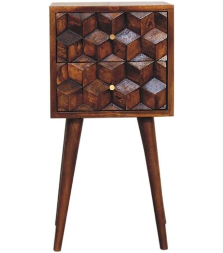 Ce chevet magnifiquement conçu est construit à partir de bois de mangue solide 100% et a une finition de châtaignier fine. Il dispose de 2 petits tiroirs sculptés en cube donnant à la pièce un caractère et une dimension supplémentaires. Il a 4 jambes de style scandinave pour moderniser votre maison et peut être installée dans des espaces compacts serrés pour aller dans tout type d'intérieur de la maison. Ce petit produit fait partie de la collection de récession. Dimensions (mm): 300D 620H 310W ...