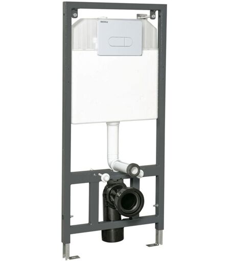 Dont €0.36 d'éco-participation.Le bâti support universel KERRA pour WC suspendu avec système de chasse d'eau intégré. Ce bâti support KERRA est compatible avec notre collection de cuvettes de WC suspendu en céramique de différents styles et coloris. Caractéristiques : Bâti universel avec cadre en acier. Dimensions du bâti : largeur 52,5 cm, hauteur de 115 à 139 cm, profondeur de 12 à 17,5 cm. Pieds réglables de 0 à 24 cm et fixations murales réglables de 12 à 17,5 cm, afin de maximiser le gain de place. Entraxes de fixation compatibles 18-23 cm. Installation sur mur porteur ou cloison renforcée, dos au mur ou en angle. Option : plaque de chasse d'eau à deux boutons blanche, noire ou chromée de dimensions 22,7 x 16,6 x 1,4 cm. Mécanisme de chasse d'eau double commande, réglable 6.5~8 L. et 1~3 L. Vanne d'admission acoustique EN 14124 pour une utilisation silencieuse. Réservoir de chasse encastré isolé contre la condensation, alimentation par le haut au centre. Pré-monté en usine pour ...
