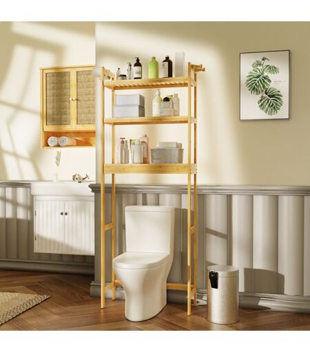Rangement fonctionnel : Trois étagères ajustables pour stocker serviettes, shampoing, et autres articles, tout en maintenant l'ordre. Gain de place : Design indépendant, idéal pour les petites salles de bain, optimisant l'espace au-dessus des toilettes. Esthétique naturelle : Fabriqué en bambou naturel, avec une finition bois qui apporte une ambiance chaleureuse et naturelle. Fonctionnalité supplémentaire : Deux crochets latéraux pour suspendre serviettes, gants de bain et autres objets. Durabilité et sécurité : Matériaux robustes, avec fixations anti-basculement pour garantir la stabilité et la sécurité. Spécifications Type : Meuble de rangement sur toilettes Style : Moderne Montage : Autoportant Pièce : Salle de bain, Toilettes, Buanderie Caractéristique : avec étagères réglabales, multifonction Matériaux : Bambou Couleur : Bois naturel Poids net : 7.45 kg Taille du produit : 63 x 26 x 170 cm Taille du colis : 99.5 x 28 x 15 cm Poids du colis : 8 kg Capacité de Charge Étagère ...
