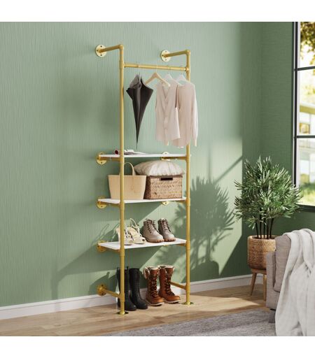 Support mural vintage – Design unique de porte-vêtements, fusion parfaite d'un tuyau industriel doré avec une étagère en MDF blanc qui crée une combinaison intemporelle et raffinée, créant une sensation vintage élégante, ajoute une touche de chic urbain, s'adapte facilement à différents styles de pièces. Porte-vêtements unique – Porte-vêtements au design unique, il dispose d'un tuyau doré idéal pour suspendre une bonne quantité de vêtements longs, de manteaux et d'accessoires lourds, supportant une charge de 25 kg, des étagères ouvertes blanches à trois niveaux pour organiser des vêtements pliants, des paniers, des boîtes à chaussettes. , chaussures, charge maximale de 30 kg chacune Porte-vêtements industriel - Ce support mural industriel allie esthétique industrielle et fonctionnalité pratique, accroche facilement ce que vous portez souvent, vous permettant d'y accéder facilement, de garder tous vos vêtements bien organisés et sans encombrement. Fiable et durable - Ce support mural ...