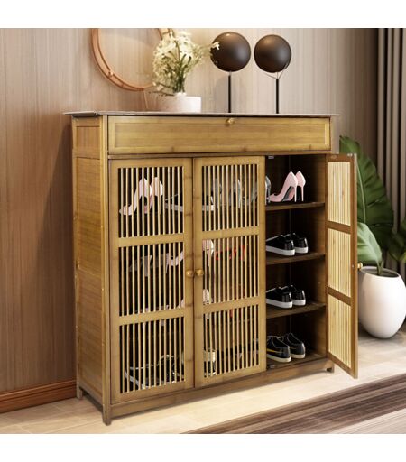 Unho - Meuble è Chaussure d'Entrée en Bambou: 98×93×32cm Armoire à Chaussures avec Tiroir Vintage, 3 Porte Rangement Chaussure à 4 Étagères pour 16 à