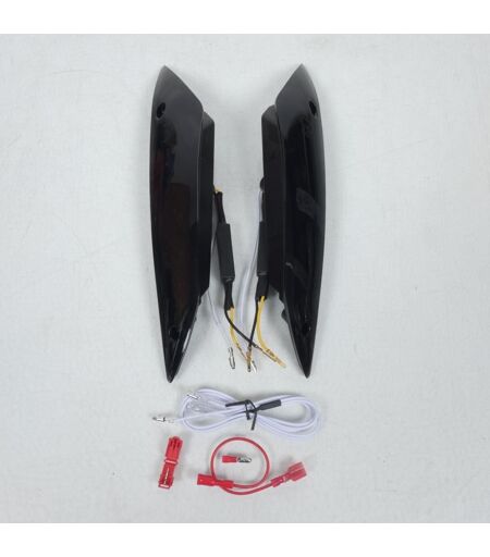 Une paire de clignotant avant droit et gauche séquentiel à Led 12V avec feux diurnes, adaptables, neufs, de marque ALPHA en plastique de coloris fumé. Feux avants diurnes intégrés. Connectique : - POUR EURO4/5 TRANSFÉRER AU RELAIS (SOUS LE CAPOT ARRIÈRE). - POUR LES VERSIONS EURO3 (CARBURATEUR): 1. PLACEZ LES CLIGNOTANTS DANS LEUR CASE. 2. AU NIVEAU DU RÉGULATEUR DE VITESSE, COUPEZ LE CÂBLE BLEU/NOIR ET LE RACCORDER AU CÂBLE BLANC (LE + CONSTANT). 3. AU NIVEAU DU RÉGULATEUR DE VITESSE, COUPEZ LE CÂBLE JAUNE/NOIR ET LE RACCORDER AU CÂBLE BLANC (LE + CONSTANT). Vendus nus la paire sans visserie ni notice. Livrés conformes à la photo. ...