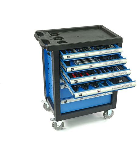 Tout travailleur indépendant ou bricoleur a besoin d’un espace de rangement bien organisé pour ses outils : tournevis, raccords en T, pinces, etc. Avec cette servante à outils bleue de 154 pièces de HBM, vous bénéficiez d’un espace de stockage efficace et fiable pour l’ensemble de vos équipements. Grâce à son poids modéré et à sa poignée robuste, elle se déplace facilement. Chaque tiroir est verrouillable individuellement grâce à un système de fermeture rapide. Son revêtement en poudre bleu donne à la servante un aspect à la fois moderne et professionnel. Deux roues fixes et deux pivotantes – dont une avec frein – assurent un déplacement fluide dans l’atelier ou sur le chantier. Le plateau supérieur dispose de compartiments bien définis, idéals pour un rangement visible des outils et la réalisation de petits travaux directement sur place. ...
