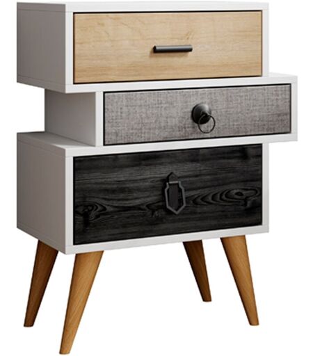 Cette table de chevet allie parfaitement le style intemporel à l''originalité et à la fonctionnalité. Elle offre une configuration différente grâce à la disposition irrégulière de ses tiroirs, qui sont ont différentes hauteurs entre ses espaces, et aux poignées au design différencié et singulier, chacune ayant une forme et une taille différentes. Les pieds effilés et coniques en couleur bois clair assurent non seulement la stabilité, mais offrent également un look élégant dans un style scandinave très tendance. Une palette de couleurs neutres qui s''adapte à tous les styles d''ameublement. Un meuble idéal pour s''intégrer dans des chambres à coucher aux décors variés et pour mettre en valeur le style personnel que vous souhaitez donner à votre espace de sommeil. Matériaux de la Table de Chevet : Structure en panneau mélaminé de 18 mm. Façades des tiroirs fabriquées en panneau mélaminé de 18 mm. Guides métaliques non amovibles. Dimensions de la Table de Chevet : Largeur : 52 cm. ...