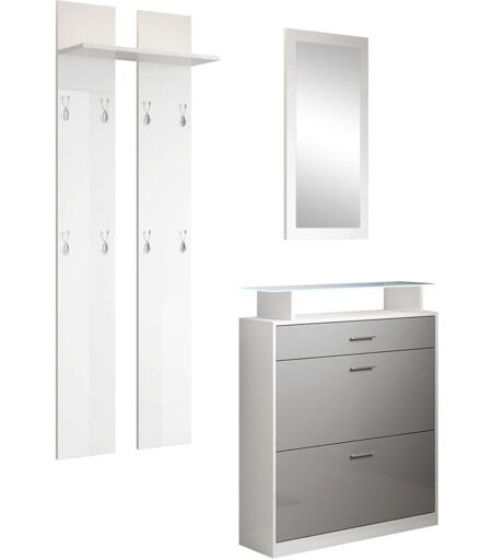 MUEBLES BONITOS Meuble à Chaussures avec LED Meuble d'entrée Portemanteau Miroir 105 x 89 x 24cm 2 portes 1 tiroir Modèle Paola Blanc brillant et Gris brillant