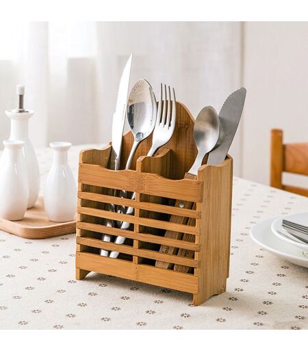 2 COMPARTIMENTS : Ce porte-couverts à 2 compartiments permet de ranger intelligemment les cuillères, couteaux, fourchettes, couverts à salade et autres ustensiles de cuisine. SIMPLE A DÉPLACER : Le range couverts se déplace facilement grâce à sa poignée intégrée. Il peut ainsi être transporté de la cuisine à la table, ou disposé à l'endroit désiré. TRÈS STABLE : Le dessous du porte couverts est percé de quelques creux permettant de caler les ustensiles qui restent ainsi bien en place, même lorsque le support est en mouvement. MATÉRIAU DURABLE : Fabriqué en bambou robuste avec un fini naturel de couleur beige, le rangement couverts est particulièrement résistant et durable dans la cuisine. ...