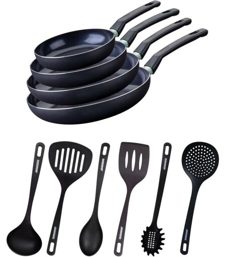 Fackelmann 9432150 Set De 4 Poêles Antiadhésives Revêtement Céramique Et 6 Ustensiles, Poêle Sans Pfas, Poêle Tous Feux, Poêle Induction, Aluminium, Rpet, Noir, Vert, 20 24 28 Et 30 Cm