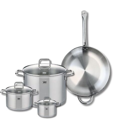 DESCRIPTION Cette batterie de cuisine sans PFAS ELO comprend une poêle à frire en inox 18/10 de 32 cm, et 3 faitouts avec couvercles en verre de tailles assorties, 12 cm, 16 cm et 26 cm, pour sadapter à vos différentes cuissons PETIT + Cet ensemble de cuisson polyvalent en inox permet de préparer une multitude de plats grâce à ses différentes tailles de poêle et marmites ; les couvercles en verre permettent de surveiller la cuisson sans perdre de chaleur COMPOSITION Cette batterie est en inox, matériau réputé pour son hygiène et sa longévité ; la poêle à frire est en inox 18/10 de haute qualité DIMENSIONS Poêle à frire 32 cm avec une capacité de 3,6 litres, faitout 12 cm de 0,6 litres, faitout 16 cm de 1,7 litres, faitout 26 cm de 9,5 litres UTILISATION Ce set de cuisson est fonctionnel et esthétique, facile à nettoyer et compatible avec tous les types de feux y compris l'induction et four (sauf le couvercle des faitouts) ENTRETIEN Compatibles avec le lave-vaisselle, ces ustensiles inox sont faciles à laver à la main ...