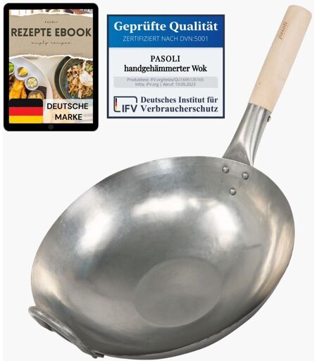 Acier au carbone de qualité supérieure grâce à la paroi fine de 1,5 mm de l'acier au carbone robuste, la chaleur se répartit rapidement et uniformément. La poêle pour une expérience de cuisson optimale Utilisation universelle que ce soit vitrocéramique, induction, gaz, feu ouvert ou barbecue, notre wok a un fond plat, ce qui lui permet d'être utilisé pour tous les types de cuisinières PRATIQUE les doigts brûlés appartiennent au passé, car ce wok en acier au carbone est équipé d'une poignée en bois qui ne chauffe pas. En outre, il y a une poignée en acier opposée pour un transport facile Couche anti-adhésive notre poêle wok n'a aucun revêtement supplémentaire qui pourrait s'écailler, car après une seule cuisson, un revêtement antiadhésif tout à fait naturel se forme Qualité supérieure nous attachons une grande importance à la qualité supérieure et aux meilleures finitions. Cette poêle traditionnelle asiatique a un diamètre de 36 cm et est fabriquée à la main ...