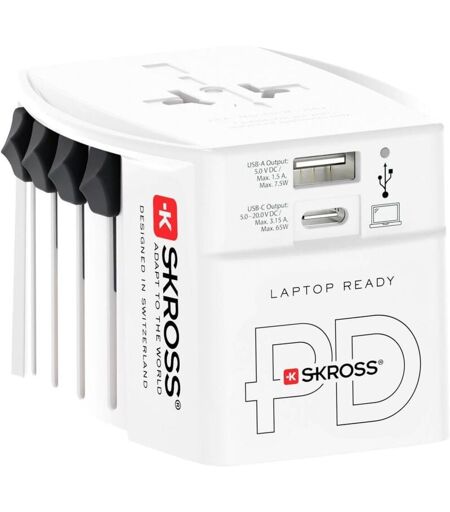 SKROSS MUV USB AC65PD Adaptateur de voyage innovant à 2 broches avec double chargeur USB intégré (1x USB C et 1x USB) Avec adaptateur mondial MUV USB L'AC65PD de SKROSS® permet aux voyageurs du monde entier de charger un périphérique USB C ainsi qu'un périphérique USB standard tout en pouvant également connecter un appareil à 2 broches non mis à la terre. Avec 1 x sortie USB C et 1 x sortie USB A, il est idéal pour charger tous vos appareils USB lors de vos déplacements à travers le monde. Par exemple. il est ainsi possible de recharger un ordinateur portable, un smartphone, une tablette, une banque d'alimentation, un appareil photo, une montre intelligente ou un lecteur de livre électronique. L'adaptateur de voyage se présente sous une forme compacte et attrayante et peut être utilisé dans plus de 220 destinations dans le monde. Câble inclus (160 cm) pour une charge rapide. • Conçu en Suisse • Convient aux équipements dotés de fiches non mises à la terre (2 broches) • Connecteurs ...
