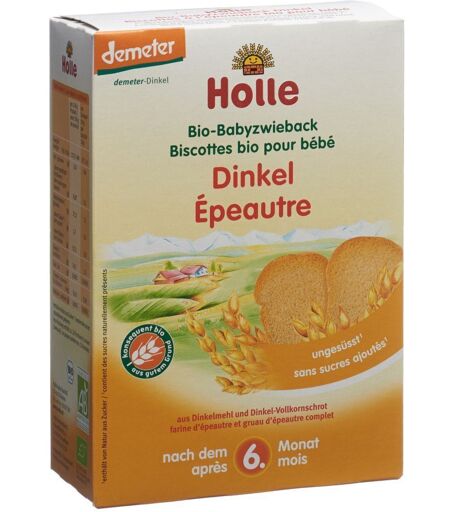 Il est important d'avoir une alimentation variée et équilibrée et un mode de vie sain.Qu'il s'agisse de biscottes, de biscuits, de barres aux fruits, de thé ou d'huile pour aliments complémentaires - des ingrédients soigneusement sélectionnés et des recettes équilibrées du point de vue nutritionnel garantissent le plaisir et la diversité pendant la phase d'alimentation complémentaire.IngrédientsFarine d'épeautre**1 83 %, épeautre égrugé**1 11 %, huile de tournesol*, levure*, thiamine (vitaminée selon la loi).*de l'agriculture biologique,**Demeter (issu de l'agriculture biodynamique),1 L'épeautre est une espèce de blé primitiveDonnées nutritionnelles Pour 100 gEnergie1723 kJ /408 kcalLipides6.0 gdont acides gras saturés0.87 gGlucides71.5 gdont sucre1.7 gdont amidon57.1 gProtéines14.7 gSel0.005 gThiamine (vitamine B1)0.55 mgSodium0.002 gConseils d'utilisationsLes biscottes bio pour bébés à l'épeautre Holle conviennent à l'alimentation des bébés après l'âge de 6 mois, soit comme en-cas à grignoter et à mâcher, soit pour préparer de savoureuses bouillies de biscottes.Précautions d'emploiAvis important :Le lait maternel est l'aliment idéal pour bébé. Il est recommandé d'allaiter au moins jusqu'aux 6 mois car le lait maternel couvre les besoins nutritionnels spécifiques des bébés et contient des anticorps qui les protègent de maladies.Si vous devez ou souhaitez utiliser une préparation infantile, veillez à respecter rigoureusement les indications de préparation. Une préparation ou utilisation inexactes pourraient nuire à la santé de l'enfant. Nous vous recommandons donc de prendre conseil auprès de personnes qualifiées dans le domaine de la médecine, de la nutrition, de la pharmacie ou bien auprès d'autres spécialistes responsables des soins maternels et infantiles.Précautions d'emploi :Conserver dans un endroit frais et sec.Après 6 mois. Ne pas laisser votre enfant grignoter sans surveillance et ne pas lui donner les biscottes en position couchée pour éviter qu'il ne s'étouffe. Respectez les instructions de préparation lors de la fabrication des bouillies pour bébé. Le bon rapport de dosage donne toujours à votre bébé les nutriments dont il a besoin. Préparez toujours la nourriture fraîche et ne réutilisez pas les quantités restantes. Comme tous les produits céréaliers, les biscottes contiennent des glucides. Le contact permanent avec des aliments contenant des glucides peut entraîner des lésions dentaires (caries), veillez donc à une hygiène dentaire suffisante dès la première dent.Conservation :Conserver à l'abri de la chaleur, au sec et dans son emballage d'origine. Utiliser le sachet ouvert dans les 2-3 semaines.Poids net200 g℮FabricantHolle baby food AGLörracherstrasse 504125 RiehenSuisse ...