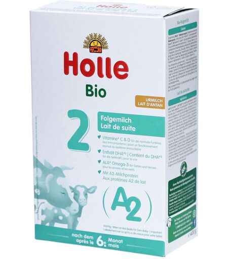 Le lait de suite Holle Bio 2 est une préparation biologique enrichie, formulée pour les bébés dès 6 mois. Il contient des protéines A2 pour une meilleure digestion, du DHA pour le développement du cerveau et des yeux, ainsi que des vitamines essentielles pour soutenir le système immunitaire.IngrédientsLAIT écrémé* A2, lactosérum partiellement déminéralisé en poudre*, huiles végétales* (palme, tournesol, colza), maltodextrine*, amidon, huile de tournesol, minéraux (chlorure de calcium, citrate de sodium, chlorure de magnésium, phosphate de calcium, sulfate de zinc, sulfate de cuivre, iodate de potassium, sélénate de sodium, sulfate de fer, carbonate de calcium, chlorure de potassium), vitamines (C, E, niacine, acide pantothénique, B6, B1, A, K, folate, biotine, D, B12), L-tryptophane, L-tyrosine, DHA* (extrait d'algues), antioxydant (extrait riche en tocophérols). *issu de l'agriculture biologiqueAllergènes : Lait.Valeurs nutritionnellesPour 100 mlÉnergie (kJ/kcal)287 / 68Graisses (g)3,6Acides gras saturés (g)1,0Acides gras monoinsaturés (g)1,9Acides gras polyinsaturés (g)0,6Acide linoléique (mg)574Acide alpha-linolénique (mg)57DHA (mg)14Glucides (g)7,7Sucres (g)5,3Lactose (g)5,2Amidon (g)0,8Protéines (g)1,4Vitamine A (µg)55,4Vitamine D (µg)1,6Vitamine E (mg)1,2Vitamine K (µg)6,6Vitamine C (mg)7,0Thiamine (Vitamine B1) (mg)0,039Riboflavine (Vitamine B2) (mg)0,14Niacine (mg)0,36Vitamine B6 (mg)0,038Acide folique (µg DFE)18,5Biotine (µg)0,11Acide pantothénique (mg)0,36Potassium (mg)81Chlorure (mg)88,2Calcium (mg)52,5Phosphore (mg)64,8Magnésium (mg)37,9Fer (mg)5,40Zinc (mg)0,59Cuivre (mg)0,46Manganèse (mg)0,057Fluorure (mg)0,0057Sélénium (mg)<0,010Iode (µg)13,5Sodium (mg)25Conseils d'utilisationPréparer le biberon en suivant les instructions sur l'emballage. Adapté pour les bébés dès 6 mois en complément d'une alimentation diversifiée.Précautions d'emploiConserver dans un endroit frais et sec. Suivre les instructions de préparation pour garantir la sécurité et la qualité du produit.Poids net400 gAdresse du FabricantHolle baby food AGLörracherstr. 504125 RiehenSuisse ...