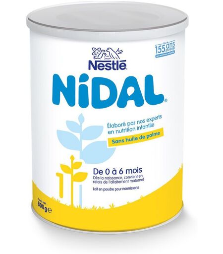 Le lait maternel est l´aliment idéal pour bébé. Il est recommandé d´allaiter au moins jusqu´aux 6 mois car le lait maternel couvre les besoins nutritionnels spécifiques des bébés et contient des anticorps qui les protègent de maladies.Si vous devez ou souhaitez utiliser une préparation infantile, veillez à respecter rigoureusement les indications de préparation. Une préparation ou utilisation inexactes pourraient nuire à la santé de l´enfant. Nous vous recommandons donc de prendre conseil auprès de personnes qualifiées dans le domaine de la médecine, de la nutrition, de la pharmacie ou bien auprès d´autres spécialistes responsables des soins maternels et infantiles Il est important d'avoir une alimentation variée et équilibrée et un mode de vie sain.Assurer le bien-être de votre bébé est votre première préoccupation. C’est aussi la nôtre ! La gamme NESTLE NIDAL est spécialement conçue pour convenir au mieux à votre bébé en complément d’une alimentation diversifiée.Les apports des formules infantiles NESTLE NIDAL :Une gamme complète pour répondre aux besoins spécifiques de bébéDes nutriments essentiels, comme le fer et 13 vitaminesUne teneur ajustée en protéines avec près de deux fois moins de protéines que le lait de vacheComposition:Lactose, huiles végétales, amidon, protéines solubles de lait partiellement hydrolysées, phosphate de Ca, phosphate de K, chlorure de Mg, chlorure de K, chlorure de Na, correcteur d'acidité acide citrique, hydroxyde de K, hydroxyde de Na, L-arginine, vitamine C, vitamine E, vitamine A, niacine, pantothénate de Ca, vitamine D, vitamine B1, vitamine B2, vitamine B6, vitamine K1, vitamine B9, vitamine B12, biotine, L-histidine, bitartrate de choline, L-tyrosine, sulfate de Fe, sulfate de Zn, sulfate de Cu, sulfate de Mn, taurine, inositol, nucléotides, L-carnitine, culture de Lactobacillus reuteri, iodure de K, sélénate de Na.Valeur nutritionelle: Pour 100 mlPar portionValeur énergétiquekJ/kcal2146/513281/67Protéinesg9,81,3Protéines solublesg9,81,3Taurinemg324,2Carnitinemg162,1Glucidesg59,97,8dont sucresg39,35,1Lactoseg39,35,1Amidong20,72,7Lipidesg263,4dont acides gras saturésg7,41Acide linoléiquemg4100536Acide α-linoléiquemg50065Fibres alimentairesg00Sels minérauxg2,350,3Sodiummg20026Potassiummg55072Chloruremg38150Calciummg35346Phosphoremg19626Magnésiummg526,8Fermg5,30,69Zincmg50,65Cuivremg0,40,06Iodeµg7710,1Séléniumµg132,4Manganèseµg11014,4Chromeµg<20<2,6Molybdèneµg<20<2,6Fluorureµg<60<7,8Vitamines Vitamine Aµg51067Vitamine Dµg6,80,9Vitamine DUI27236Thiaminemg0,50,07Riboflavinemg1,150,15Niacinemg5,40,71Acide pantothéiquemg4,80,6Vitamine B6mg0,360,05Biotineµg11,21,5Acide foliqueµg8111Vitamine B12µg1,10,14Vitamine Cmg699Vitamine Kµg445,8Vitamine Emg101,3Cholinemg567,3Inositolmg405,2Nucléotidesmg152 Conseil d'utilisation:Stérilisez le biberon, la tétine et la bague soigneusement nettoyés pendant 5 minutes à l'eau boillante ou à l'aide d'un désinfectant approprié.Consultez le tableau des quantités recommandées pour... ...