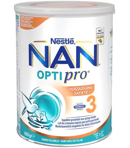 Avis important Le lait maternel est l´aliment idéal pour bébé. Il est recommandé d´allaiter au moins jusqu´aux 6 mois car le lait maternel couvre les besoins nutritionnels spécifiques des bébés et contient des anticorps qui les protègent de maladies. Si vous devez ou souhaitez utiliser une préparation infantile, veillez à respecter rigoureusement les indications de préparation. Une préparation ou utilisation inexactes pourraient nuire à la santé de l´enfant. Nous vous recommandons donc de prendre conseil auprès de personnes qualifiées dans le domaine de la médecine, de la nutrition, de la pharmacie ou bien auprès d´autres spécialistes responsables des soins maternels et infantiles Prenez attention à une alimentation variée et équilibrée et un mode de vie sain. À partir de 1 an, NAN Satiété 3 est parfaitement adapté aux besoins de votre enfant. Ce lait de croissance en poudre contribue à son bon développement et le soutient durant cette étape importante. Sa formule contient : Des immunonutriments comme les vitamines A, C et D qui agissent sur le système immunitaire de votre enfant. ALA (OMEGA-3) qui participent au développement normal de son cerveau. Une combinaison unique en protéines, grâce à Optipro®, un procédé exclusif Nestlé. Composition: lait écrémé, maltodextrine, amidon de pomme de terre, oléine de palme, perméat de petit-lait, protéines de lactosérum, lactose, huile de colza faible en acide érucique, huile de tournesol, citrate de calcium, amidon de maïs, émulsifiant, lécithine de soja, citrate de potassium, phosphate de calcium, huile de poisson, vitamines, C, E, acide pantothénique, niacine, B1, A, B6, B2, acide folique, K, biotine, D, B12, chlorure de sodium, citrate de sodium, chlorure de magnésium, phosphate de potassium, huile végétale de mortierella alpina, sulfate de fer, sulfate de zinc, culture Bifidus (BL), culture thermophilus, sulfate de cuivre, sélénate de sodium, iodure de potassium. Valeur nutritionnelle: Pour 100 g Pour 100 ml Énergie kJ/kcal 2031/484 280/67 Matières grasses g 22 3 dont acides gras saturés g 6,2 0,86 Glucides g 61 8,4 dont sucres g 34 4,7 dont amidon g 12 1,7 Protéines g 11 1,5 Sel g 0,55 0,076 Vitamines Vitamine A µg 550 76,1 Vitamine D µg 9,1 1,3 Vitamine E mg 11 1,5 Vitamine K µg 47 6,5 Vitamine C mg 87 12 Thiamine mg 1,0 0,14 Riboflavine mg 1,0 0,14 Niacine mg 4,5 0,63 Acide pantothénique mg 5,7 0,79 Vitamine B6 mg 0,57 0,079 Biotine µg 17 2,4 Acide folique µg 106 14,7 Vitamine B12 µg 1,4 0,19 Minéraux Calcium mg 568 78,6 Potassium mg 595 82,3 Chlorure mg 360 49,8 Phosphore mg 358 49,5 Magnésium mg 44 6,09 Manganèse mg 0,048 0,0066 Fluorure mg <0,050 <0,0069 Sélénium µg 8,8 1,2 Fer mg 7,6 1,1 Iode µg 125 17,3 Cuivre mg 0,37 0,051 Zinc mg 5,3 0,73 Conseil d'utilisation: Conseils pour une préparation optimale du biberon Pour des biberons de plus de 250 ml , utiliser un biberon de capacité adéquate (contenu > 300ml) Stériliser dans l’eau bouillante le biberon, la bague et la tétine... ...