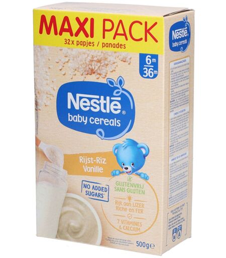 Avis important Le lait maternel est l´aliment idéal pour bébé. Il est recommandé d´allaiter au moins jusqu´aux 6 mois car le lait maternel couvre les besoins nutritionnels spécifiques des bébés et contient des anticorps qui les protègent de maladies. Si vous devez ou souhaitez utiliser une préparation infantile, veillez à respecter rigoureusement les indications de préparation. Une préparation ou utilisation inexactes pourraient nuire à la santé de l´enfant. Nous vous recommandons donc de prendre conseil auprès de personnes qualifiées dans le domaine de la médecine, de la nutrition, de la pharmacie ou bien auprès d´autres spécialistes responsables des soins maternels et infantiles Prenez attention à une alimentation variée et équilibrée et un mode de vie sain.Contribue au système immunitaire et au développement cognitif de votre bébé.Composition:Farine de riz et farine de riz hydrolysée (99,2%), carbonate de calcium, vitamines (C, E, niacine, B1, A, B6, acide folique, D), fumarate de fer, vanilline, culture bifidus (BL), sulfate de zinc, iodure de potassium.Valeur nutritionelle: Par 100 g % AJR* Par Portion % AJR* Energie kJ / kcal 1649/389 863/205 Graisses g 3 5.9 dont acides gras saturés g 0,6 2.3 Glucides g 83 34 dont sucres g 4 13 Fibres g 1 0,3 Protéines g 7 3.8 Sel g 0,1 0,1 Calcium mg 180 45% 167 42% Fer mg 7.5 125% 3.6 59% Zinc mg 1.2 30% 1.4 34% Iode μg 60 86% 42,2 60% Vitamine A μg 300 75% 165 41% Vitamine D μg 9 90% 5 50% Vitamine E mg 5.5 3.8 Vitamine C mg 70 280% 35 140% Thiamine (B1) mg 0,7 140% 0,3 59% Niacine (B3) mg 6.5 72% 2.5 % Vitamine B6 mg 0,3 43% 0,16 22% Acide folique μg 65 65% 49 49% Conseil d'utilisation:Pour les nouveau-nés si ils ne sont pas allaitées au seinPrécautions d'emploi:L'apport journalier recommandé ne doit pas être dépassé. Conserver dans un endroit frais (6-25 °C) et à l'abri de la lumière. Tenir hors de portée des enfants.Poids net: 500 gFabricant: Nestlé BelgiluxRue de Birmingham 2211070 Anderlecht, Belgien ...