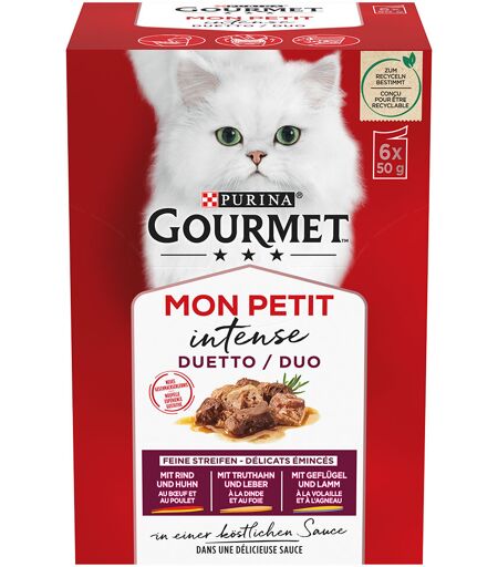 Gourmet Mon Petit est une sélection de recettes exquises, spécialement développées pour le plaisir des chats adultes. Votre chat va se régaler en dégustant ces délicieux émincés de viande et de poisson en sauce. Ces recettes sont tout simplement... ...