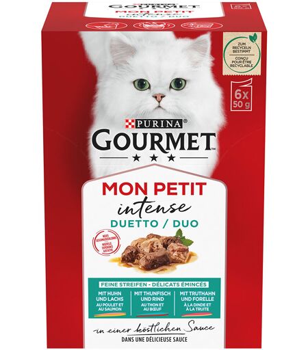 Gourmet Mon Petit est une sélection de recettes exquises, spécialement développées pour le plaisir des chats adultes. Votre chat va se régaler en dégustant ces délicieux émincés de viande et de poisson en sauce. Ces recettes sont tout simplement... ...