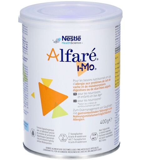 Il est important d'avoir une alimentation variée et équilibrée et un mode de vie sain.Alfaré® HMO® est une denrée alimentaire destinée à des fins médicales spéciales, dès la naissance. Il s'agit d’une préparation nutritionnelle complète à base d’hydrolysat poussé de protéines de lactosérum, enrichie en triglycérides à chaînes moyennes, 2’-fucosyllactose (2’-FL) et lacto-N-néotétraose (LNnT). Elle est indiquée pour les besoins nutritionnels des nourrissons et jeunes enfants souffrant d’allergie aux protéines de lait de vache, de malabsorption digestive ou de diarrhées aiguës. Sans lactose, sans gluten, sans fibres.IngrédientsMaltodextrine, huiles végétales (tournesol, colza, coco), hydrolysat poussé de protéines de lactosérum (protéine de LAIT), triglycérides à chaînes moyennes, amidon de pomme de terre, minéraux, 2’-fucosyllactose, lacto-N-néotétraose, huile de Mortierella alpina (ARA), huile extraite de la microalgue Schizochytrium sp., bitartrate de choline, vitamines, L-arginine, taurine, inositol, L-histidine, nucléotides, L-carnitine.Allergènes : Lait.Valeurs nutritionnelles Pour 100 ml reconstitués Énergie67 kcal / 283 kJ Lipides3,4 g - Acides gras saturés1,6 g - TCM1,3 g - Mono-insaturés1,0 g - Poly-insaturés0,58 g -- Ac. α-linolénique59 mg -- DHA18 mg -- Ac. linoléique459 mg -- ARA18 mg Glucides7,3 g - Sucres0,27 g Fibres alimentaires0,15 g -- LNnT0,05 g -- 2’-FL0,10 g Protéines1,9 g Sel0,084 g Sodium34 mg Potassium84 mg Chlorure61 mg Calcium71 mg Phosphore47 mg Magnésium8,1 mg Fer0,70 mg Zinc0,67 mg Cuivre0,058 mg Manganèse0,009 mg Sélénium3,5 µg Iode16 µg Vitamine A67 µg Vitamine D1,6 µg Vitamine E1,5 mg Vitamine K6,1 µg Vitamine C11 mg Vitamine B10,069 mg Vitamine B20,14 mg Niacine0,94 mg / 1,7 mg NE Vitamine B60,054 mg Acide folique10 µg Folates17 µg-EFA Vitamine B120,19 µg Biotine1,6 µg Acide pantothénique0,45 mg Taurine5,4 mg L-Carnitine1,1 mg Choline20 mg Inositol4,7 mg Nucléotides2,0 mg Osmolarité180 mOsm/l Conseils d'utilisationUtiliser sous contrôle médical. Reconstitution avec mesurette (4,5 g), 3 dosettes pour 90 ml d’eau. Donner immédiatement après préparation. Convient dès la naissance ou dès 6 mois en complément d’une alimentation diversifiée.Précautions d'emploiNe pas utiliser en cas de galactosémie ou malabsorption glucose-galactose. Le lait maternel est préférable. Suivre les instructions sur l’étiquette. Préparer un seul biberon à la fois.Poids net400 gAdresse du FabricantNestlé Health Science 34-40 rue Guynemer92130 Issy-les-Moulineaux ...