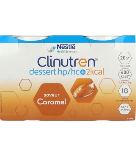 Complément alimentaire à utiliser dans le cadre d’une alimentation variée, équilibrée et d’un mode de vie sain. Clinutren® Dessert HP/HC+ 2kcal est une denrée alimentaire destinée à des fins médicales spéciales. Nutrition clinique orale pour les besoins nutritionnels des patients adultes en cas de dénutrition, associés ou non à des troubles du métabolisme glucidique (diabète type 2). Clinutren Dessert Hp Hc+ 2kcal Creme Caramel 200g X4 est un complément alimentaire disponible en pharmacie. Il ne peut se substituer à un mode de vie sain et à une alimentation variée et équilibrée. Ne prenez pas plus que la dose quotidienne recommandée indiquée sur l'emballage. Demandez conseil à votre pharmacien. Tenir hors de portée des enfants. Ne pas agiter le produit. A consommer de préférence frais, lors d'une collation ou d'un repas. Non ouvert, conserver dans un endroit sec et frais. Après ouverture, bien recouvrir, conserver au réfrigérateur et consommer dans les 24 heures. Si le produit est versé dans un autre récipient, bien recouvrir et consommer dans les 6 heures Ingredients Eau, Sirop de glucose, Protéines de lait, Huile de colza, Saccharose, Crème de lait, Arome (selon saveur), 13 vitamines, 15 minéraux et oligo-éléments, Cacao maigre en poudre (1,3%)*. Allergène : lait *Pour une information complète, se référer à l'étiquette sur l'emballage. 400 kcal - 20 g de protéines / cup de 200 g Indice Glycémique bas1 (<55) qui aide au crontrole du métabolisme des glucides Tolérance optimisée : sans lactose, sans gluten, sans fibre Format de 125 g spécifique pour l'hopital ...