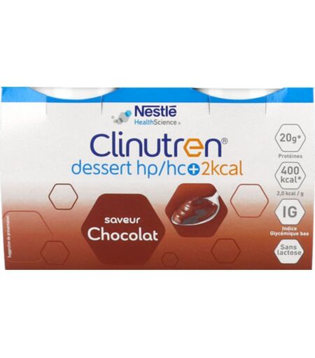 Complément alimentaire à utiliser dans le cadre d’une alimentation variée, équilibrée et d’un mode de vie sain. Clinutren® Dessert HP/HC+ 2kcal est une denrée alimentaire destinée à des fins médicales spéciales. Clinutren Dessert Hp Hc+ 2kcal Creme Chocolat 200g X4 est un complément alimentaire disponible en pharmacie. Il ne peut se substituer à un mode de vie sain et à une alimentation variée et équilibrée. Ne prenez pas plus que la dose quotidienne recommandée indiquée sur l'emballage. Demandez conseil à votre pharmacien. Tenir hors de portée des enfants. Nutrition clinique orale pour les besoins nutritionnels des patients adultes en cas de dénutrition, associés ou non à des troubles du métabolisme glucidique (diabète type 2). Ingredients Eau, Sirop de glucose, Protéines de lait, Huile de colza, Saccharose, Crème de lait, Arome (selon saveur), 13 vitamines, 15 minéraux et oligo-éléments, Cacao maigre en poudre (1,3%)*. Allergène : lait *Pour une information complète, se référer à l'étiquette sur l'emballage. 400 kcal - 20 g de protéines / cup de 200 g Indice Glycémique bas1 (<55) qui aide au crontrole du métabolisme des glucides Tolérance optimisée : sans lactose, sans gluten, sans fibre Format de 125 g spécifique pour l'hopital ...