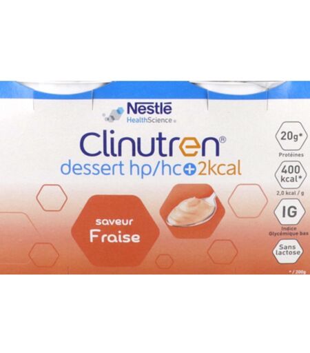 Complément alimentaire à utiliser dans le cadre d’une alimentation variée, équilibrée et d’un mode de vie sain. Clinutren Dessert Hp Hc+ 2kcal Creme Fraise Biscuitee 200g X4 est un complément alimentaire disponible en pharmacie. Il ne peut se substituer à un mode de vie sain et à une alimentation variée et équilibrée. Ne prenez pas plus que la dose quotidienne recommandée indiquée sur l'emballage. Demandez conseil à votre pharmacien. Tenir hors de portée des enfants. Clinutren® Dessert HP/HC+ 2kcal est une denrée alimentaire destinée à des fins médicales spéciales. Nutrition clinique orale pour les besoins nutritionnels des patients adultes en cas de dénutrition, associés ou non à des troubles du métabolisme glucidique (diabète type 2). Ingredients Eau, Sirop de glucose, Protéines de lait, Huile de colza, Saccharose, Crème de lait, Arome (selon saveur), 13 vitamines, 15 minéraux et oligo-éléments, Cacao maigre en poudre (1,3%)*. Allergène : lait *Pour une information complète, se référer à l'étiquette sur l'emballage. 400 kcal - 20 g de protéines / cup de 200 g Indice Glycémique bas1 (<55) qui aide au crontrole du métabolisme des glucides Tolérance optimisée : sans lactose, sans gluten, sans fibre Format de 125 g spécifique pour l'hopita ...