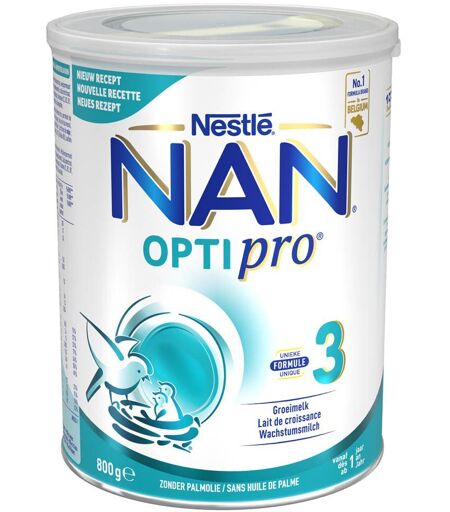 Avis importantLe lait maternel est l´aliment idéal pour bébé. Il est recommandé d´allaiter au moins jusqu´aux 6 mois car le lait maternel couvre les besoins nutritionnels spécifiques des bébés et contient des anticorps qui les protègent de maladies.Si vous devez ou souhaitez utiliser une préparation infantile, veillez à respecter rigoureusement les indications de préparation. Une préparation ou utilisation inexactes pourraient nuire à la santé de l´enfant. Nous vous recommandons donc de prendre conseil auprès de personnes qualifiées dans le domaine de la médecine, de la nutrition, de la pharmacie ou bien auprès d´autres spécialistes responsables des soins maternels et infantilesIl est important d'avoir une alimentation variée et équilibrée et un mode de vie sain.NAN OPTIPRO 3 est un lait de croissance parfaitement adapté aux besoins de votre enfant dès ses 1 an.NAN OPTIPRO 3 contribue à donner des bases solides pour la vie, grâce :Aux immunonutriments comme le zinc et les vitamines A, C et D qui soutiennent son système immunitaire.Aux Omega-3 (ALA) qui participent au développement normal de son cerveau.Composition:Lait entier, lait écrémé, lactose, perméat de lactosérum (lait), huile de colza faible en acide érucique, huile de tournesol, carbonate de calcium, émulsifiant : lécithine de soja; phosphate de potassium, vitamines (C, B2, A, D, B12), sulfate de fer, sulfate de zinc, culture Bifidus (BL), iodure de potassium.Valeur nutritionnelle: Par 100 g de poudrePar 100 ml préparéAJR*ÉnergiekJ/kcal2023/483280/67 Matières grassesg223,0 - dont acides gras saturésg4,50,62 Glucidesg659,0 - dont sucresg659,0 Protéinesg7,251,0 Selg0,240,034 Vitamines Vitamine Aμg43360,015%Vitamine Dμg7,61,116%Vitamine Cmg1101533%Riboflavine (Vit. B2)mg1,80,2536%Vitamine B12μg2,90,4050%Minéraux Calciummg91612723%Fermg8,71,215%Zincmg5,40,7515%Iodeμg13018,023%**Apport journalier de référencesConseil d'utilisation:Conseils pour une préparation optimale du biberon Pour des biberons de plus de 250 ml , utiliser un biberon de capacité adéquate (contenu > 300ml)Stériliser dans l’eau bouillante le biberon, la bague et la tétine pendant 5 minutes.Verser dans le biberon la quantité d’eau indiquée, tiédie à 37°C. Utiliser de l’eau faiblement minéralisée.Ajouter le nombre de mesurettes arasées recommandé. La reconstitution est commune à tous les laits infantiles =1 mesurette par 30 ml d’eau. Pour maintenir le nombre de Bifidus et Lactobacillus vivants, il est important que l’eau, préalablement bouillie ou chauffée, soit refroidie à 37°C avant d’ajouter la poudre.Fermer le biberon et le secouer énergiquement pendant minimum 15 secondes jusqu’à bonne dissolution.Après le repas, laver et rincer soigneusement le biberon, la bague et la tétine, puis laisser sécher.Précautions d'emploi:Il est important de respecter le mode de préparation indiqué, et les instructions suivantes afin d'éviter des risques pour la santé de votre bébé. Nettoyez votre plan de travail puis lavez-vous... ...