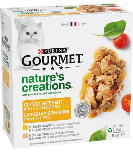 Composé de tendres morceaux de poisson ou de volaille servis dans une savoureuse sauce, les recettes Gourmet Nature's Creations 8 x 85 g feront ronronner de plaisir même les félins les plus difficiles ! Ces repas équilibrés fourniront à votre chat... ...
