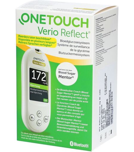 Contenu de la livraison:Lecteur OneTouch Verio Reflect® (2 piles bouton au lithium CR032 incluses)10 bandelettes réactives OneTouch Verio®#Stylo autopiqueur OneTouch®Delica®10 lancettes stériles OneTouch®Delica®Manuel d’utilisationGuide de démarrageÉtui de transportCaractéristiques du produit:La fonction Coach de Glycémie (Blood Sugar mentor™) vous fournit des informations, des conseils, et des encouragements personnalisés pour vous permettre d'agir et ainsi prévenir les hypo et les hyperglycémies.*Avec son code couleur Coloursure® Plus, le lecteur de glycémie OneTouch Verio Reflect® positionne instantanément vos résultats dans l’objectif, en dehors ou s’approchant des seuils hypo ou hyper.**Et quand vous le connectez à l'application mobile OneTouch Reveal®, la fonction Coach de Glycémie vous fournit encore plus d'informations pour vous aider à gérer votre diabète.Description du produit:Le système d'autosurveillance de la glycémie OneTouch Verio Reflect® est destiné à être utilisé pour l'auto-test, en usage externe (diagnostic in vitro) par les personnes diabétiques pour la mesure quantitative de la glycémie (sucre) dans les échantillons de sang total capillaire frais prélevés sur le bout du doigt afin de faciliter la surveillance de l'efficacité du suivi du diabète.Le lecteur de glycémie OneTouch Verio Reflect® analyse et suit les tendances glycémiques, et fournit des conseils (messages éducationnels, comportementaux et motivationnels) pour aider à comprendre et à gérer les niveaux de glycémie ainsi qu'à détecter les excursions supérieures ou inférieures à un objectif souhaité. Le lecteur est également conçu pour communiquer sans fil avec les applications « diabète » compatibles pour saisir, transférer et analyser les données et informations concernant la glycémie afin d'aider la prise en charge du diabète.* Selon les recommandations de votre médecin. Veuillez consulter votre médecin avant d'effectuer tout changement significatif de votre traitement.ColourSure® est développé sur les lecteurs de glycémie OneTouch® disposant d'un code couleur. Il montre instantanément aux patients si ses résultats de glycémie sont dans l’objectif ou à l’extérieur de l’objectif.** Par défaut, le code couleur s’affiche en fonction de vos objectifs Avant et Après Repas pré-configurés dans le lecteur. Avec l’aide de votre professionnel de santé, confirmez ou modifiez les seuils « bas » et « élevé » Avant et Après Repas de votre lecteur de glycémie en fonction de vos propres besoins. Si vous activez le mode de base, le code couleur s’affiche en fonction de l’objectif général paramétré dans le lecteur sans tenir compte des repas.Conseils d'utilisation:Lire attentivement le mode d'emploi.Précautions d'emploi:Le système d'autosurveillance de la glycémie OneTouch Verio Reflect® ne remplace pas et ne se substitue pas aux recommandations d'un professionnel de santé. Il ne doit pas être utilisé pour diagnostiquer ou dépister le diabète, ou chez les nouveau-nés.Lorsque le... ...