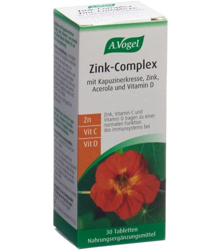 Complément alimentaire à utiliser dans le cadre d’une alimentation variée, équilibrée et d’un mode de vie sain.A.VOGEL Zinc-Complexe est un complément alimentaire combinant zinc, capucine, acérola et vitamine D. Il est conçu pour soutenir le système immunitaire et maintenir une santé optimale dans le cadre d’une alimentation variée et équilibrée.IngrédientsAgent de charge (cellulose microcristalline), poudre de jus d'acérola (31.4 %), citrate de zinc, antiagglomérants : gomme de cellulose réticulée, sels de magnésium d'acides gras alimentaires, extrait de capucine (0.9 %), poudre de vitamine D3 (issue du lichen).Valeurs nutritionnelles Pour 2 comprimés Énergie11 kJ / 3 kcal Graisse< 0.5 g - dont acides gras saturés< 0.5 g Hydrates de carbone< 0.5 g - dont sucres< 0.5 g Protéines< 0.5 g Sel< 0.01 g Zinc5.3 mg Vitamine C100 mg Vitamine D310 µg Conseils d'utilisationPas de conseil de consommation spécifique mentionné.Précautions d'emploiNe pas dépasser la quantité journalière recommandée. Conserver au frais (6-25 °C) et à l'abri de la lumière. Tenir hors de portée des enfants.Poids net30 comprimésAdresse du FabricantA.Vogel AGGrünaustrasse 49325 Roggwil TGSuisse ...