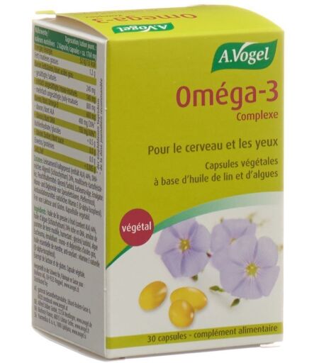 Complément alimentaire à utiliser dans le cadre d’une alimentation variée, équilibrée et d’un mode de vie sain.A.Vogel Omega 3 Complexe est un complément alimentaire 100 % végétal qui contient des acides gras essentiels oméga-3, notamment l'acide docosahexaénoïque (DHA) et l'acide alpha-linolénique (ALA). Le DHA contribue au fonctionnement normal du cerveau et au maintien d'une vision normale. L'ALA aide au maintien d'une cholestérolémie normale.IngrédientsHuile de lin pressée à froid (contient ALA) 44 %, Huile d'algue (Schizochytrium) 24 % riche en DHA, Amidon de pomme de terre modifié, Humectants : glycérol, sorbitol, Algue Eucheuma, Émulsifiant : mono- et diglycérides d'acides gras, Huile essentielle de menthe, Antioxydant : vitamine E naturelle (D-alpha-tocophérol), Exempt de lactose et de GLUTEN. Capsule végétale.Allergènes : Gluten.Valeurs nutritionnelles Pour 2 capsules Énergie 52 kJ / 13 kcal Graisses 1.2 g - dont acides gras saturés 240 mg Glucides 0.5 g - dont sucres 0.0 g Protéines 0.0 g Sel <0.005 g Oméga 3 600 mg - dont ALA 400 mg / 20%* - dont DHA 150 mg / 60%* *De la dose journalière recommandée.Conseils d'utilisationPrendre 2 capsules par jour avec de l'eau pendant les repas principaux.Précautions d'emploiConserver au sec et à l'abri de la lumière. Consommer dans les deux mois suivant l'ouverture. Ne pas dépasser la dose journalière recommandée.Poids net26 g = 30 capsulesAdresse du FabricantA.Vogel AGGrünaustrasse 4CH-9325 Roggwil TG ...