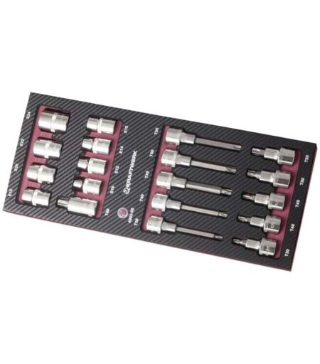 Contenu de la livraison :PRO LINE EVA3 jeu de douilles 1/2“, 19 pièces.Douilles extérieures TX 1/2'' : E1 - E24Douilles de tournevis 1/2'', 55 mm : TX T3 - T6Douilles de tournevis 1/2'', 1 mm : TX T3 - T56 Caractéristiques techniques: Ligne de produit: PRO LINECouleur: NoirPoids du produit: 1,71 kgLargeur du produit: 170 mmLongueur du produit: 390 mmNombre de pièces: 19Verrouillage: Sans verrouillageType d'outil: EVA Éthylène-vinyl-acétateLumière secondaire: Non Note : La décoration n'est pas incluse dans la livraison. ...